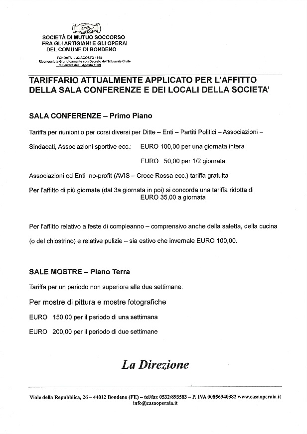 COMUNICAZIONI E’ entrato in vigore il nuovo tariffario della Società Operaia per il noleggio delle sale e del chiostro.